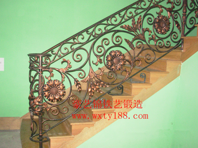 欄桿上有多個大型的花朵圖案,這些花朵圖案看起來像是向日葵,花瓣呈現出自然的卷曲形態,栩栩如生。欄桿的扶手部分也有精致的花紋設計,與整體風格相協調。
