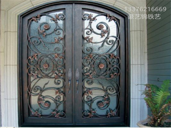 進(jìn)戶(hù)門(mén)的整體框架是深色的,可能是由木材或金屬制成。門(mén)的上半部分有兩塊玻璃,玻璃上有精致的鐵藝花紋裝飾,這些花紋呈現(xiàn)出卷曲和螺旋的形狀,給人一種優(yōu)雅且復(fù)古的感覺(jué)。